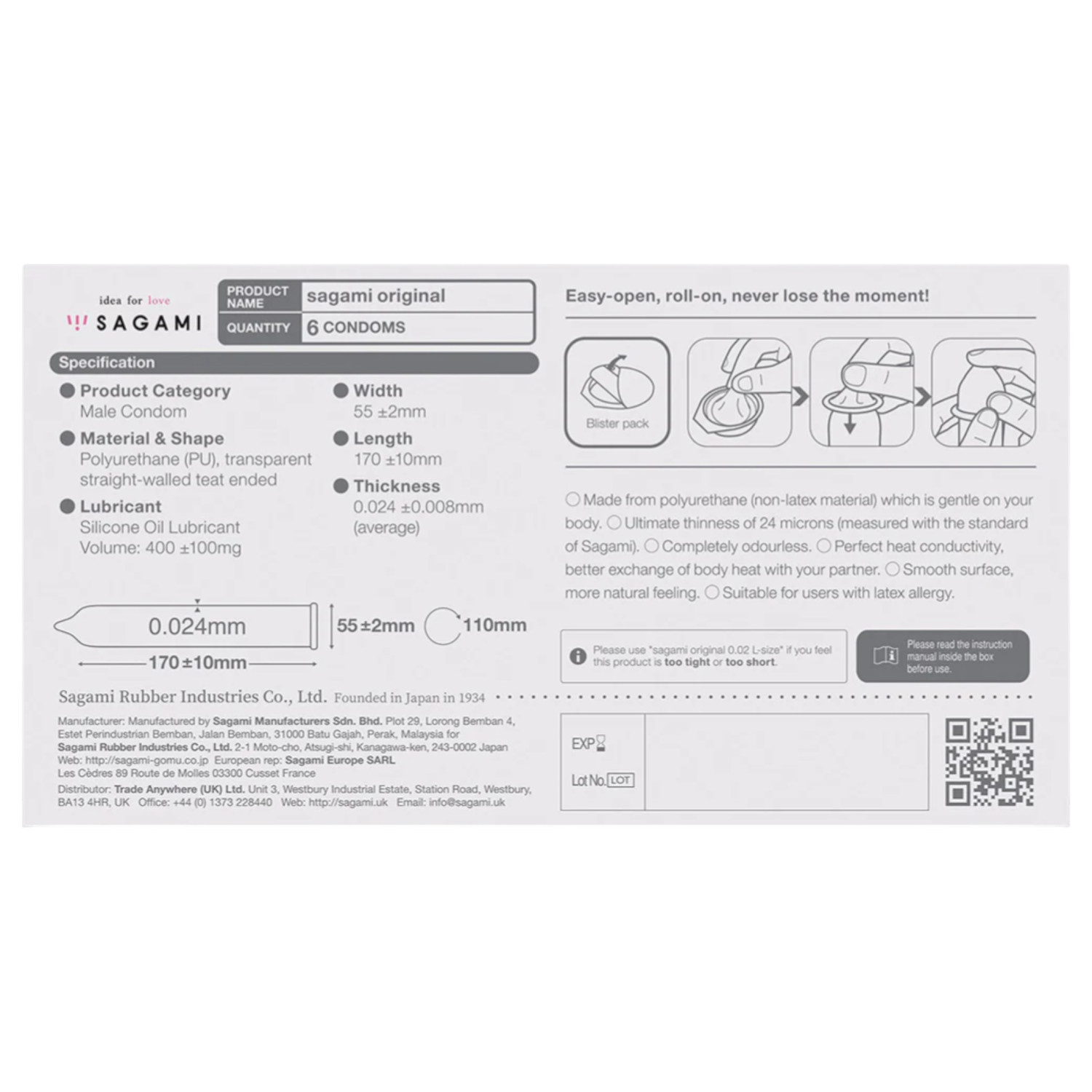 Förpackningen med Sagami Original innehåller 6 stycken och är ett perfekt exempel på japansk precision och kvalitet. Tillverkad av ultratunn polyuretan, är det ett perfekt val för dem med känslig hud och latexallergi. Osynligt skydd, men ändå maximal säkerhet – vid varje tillfälle.